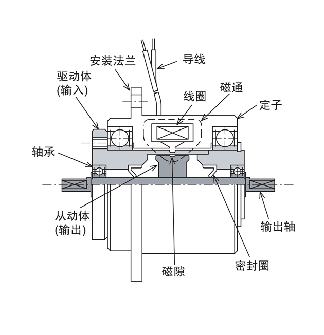 微型磁粉離合器是由主動轉(zhuǎn)子(輸入軸)、從動轉(zhuǎn)子(輸出軸)、含激磁線圈的磁軛組成,三部分相對同心裝配,形成了一個可以相對轉(zhuǎn)動的整體,在主動轉(zhuǎn)子和從動轉(zhuǎn)子之間的環(huán)形空隙(工作腔)內(nèi)填有高導(dǎo)磁的合金磁粉。